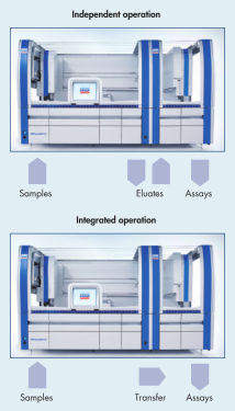 QIAsymphony AS可与QIAsymphony SP核酸提取纯化分析仪直接接口。为了减少手工操作步骤,降低样本污染风险,在QIAsymphony SP核酸提取纯化分析仪上处理的样本可自动转移到QIAsymphony AS(完整操作模式)。为增加灵活性,QIAsymphony SP核酸提取纯化分析仪和AS也可独立操作。之前处理的样本或在不同QIAsymphony SP核酸提取纯化分析仪上处理的样本都能手动转移到QIAsymphony AS。